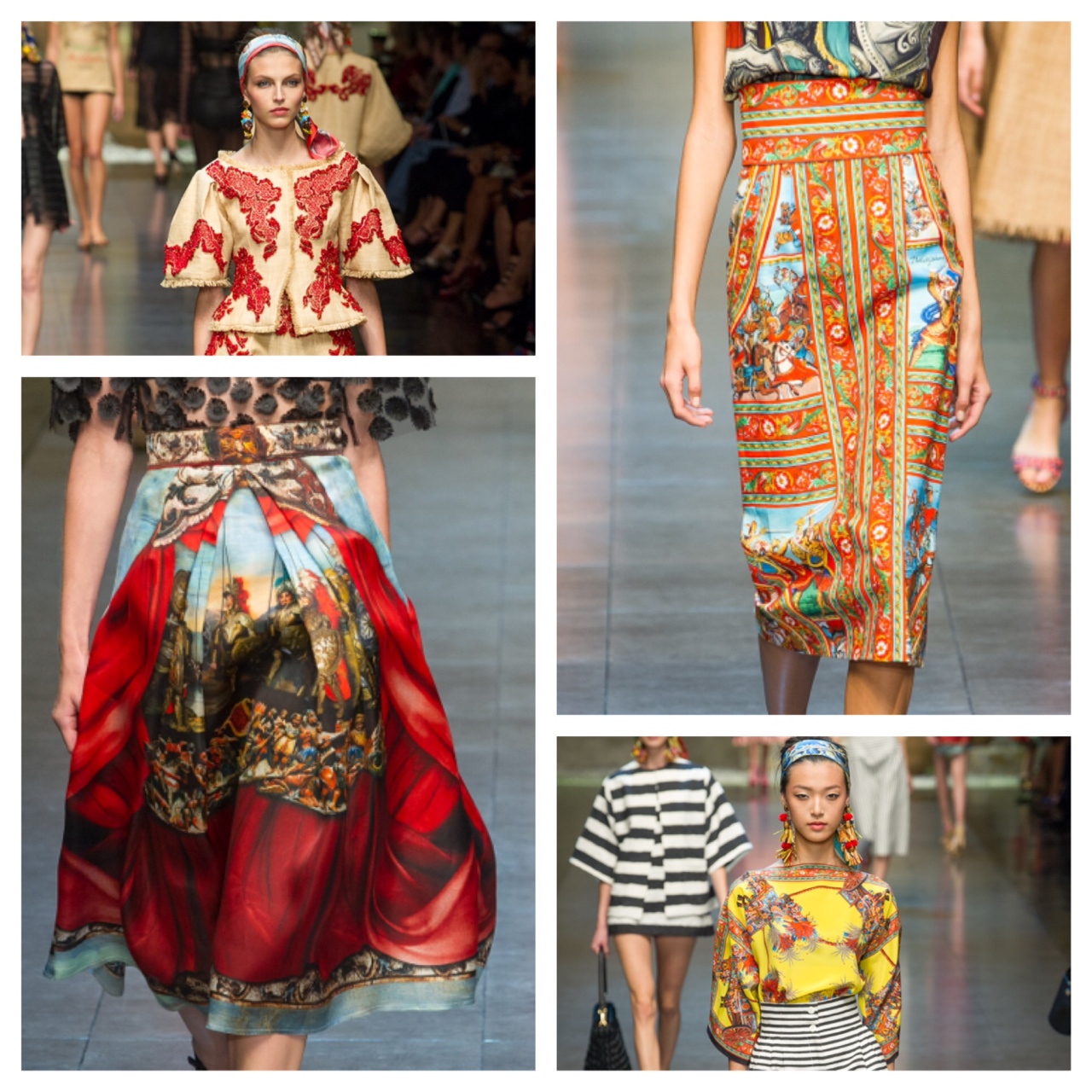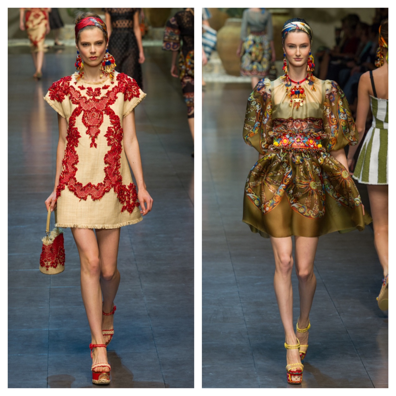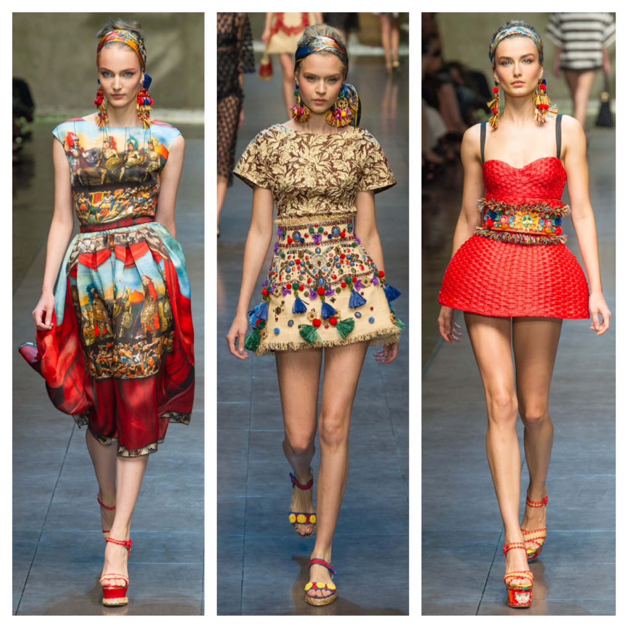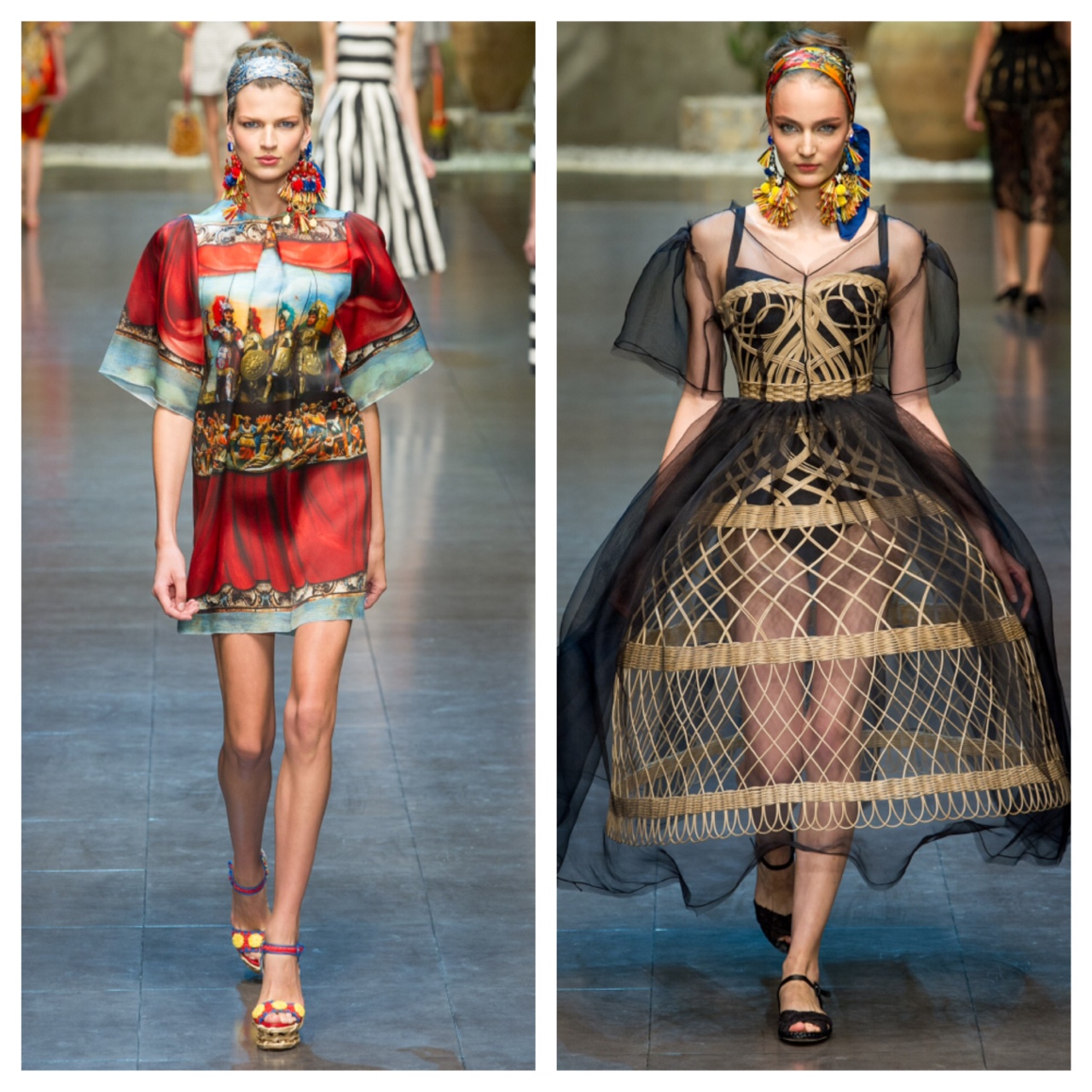 My favorite designers Dolce & Gabbana show cased another spectacular runway show this season. With their baroque collection last year, which caused the fashion world to go head over heels. Dolce & Gabbana always walked on the fine line between being tacky and being high-end clothing, and as always they succeed! They are ingenious artists! This collection takes everyone back to the time periods that Sicily has gone through starting from the Romans. The Roman prints, The baroque embellishments, the 20’s and 30’s dress and swimwear designs. Only Dolce & Gabbana can have all of that and turn it into something spectacular.