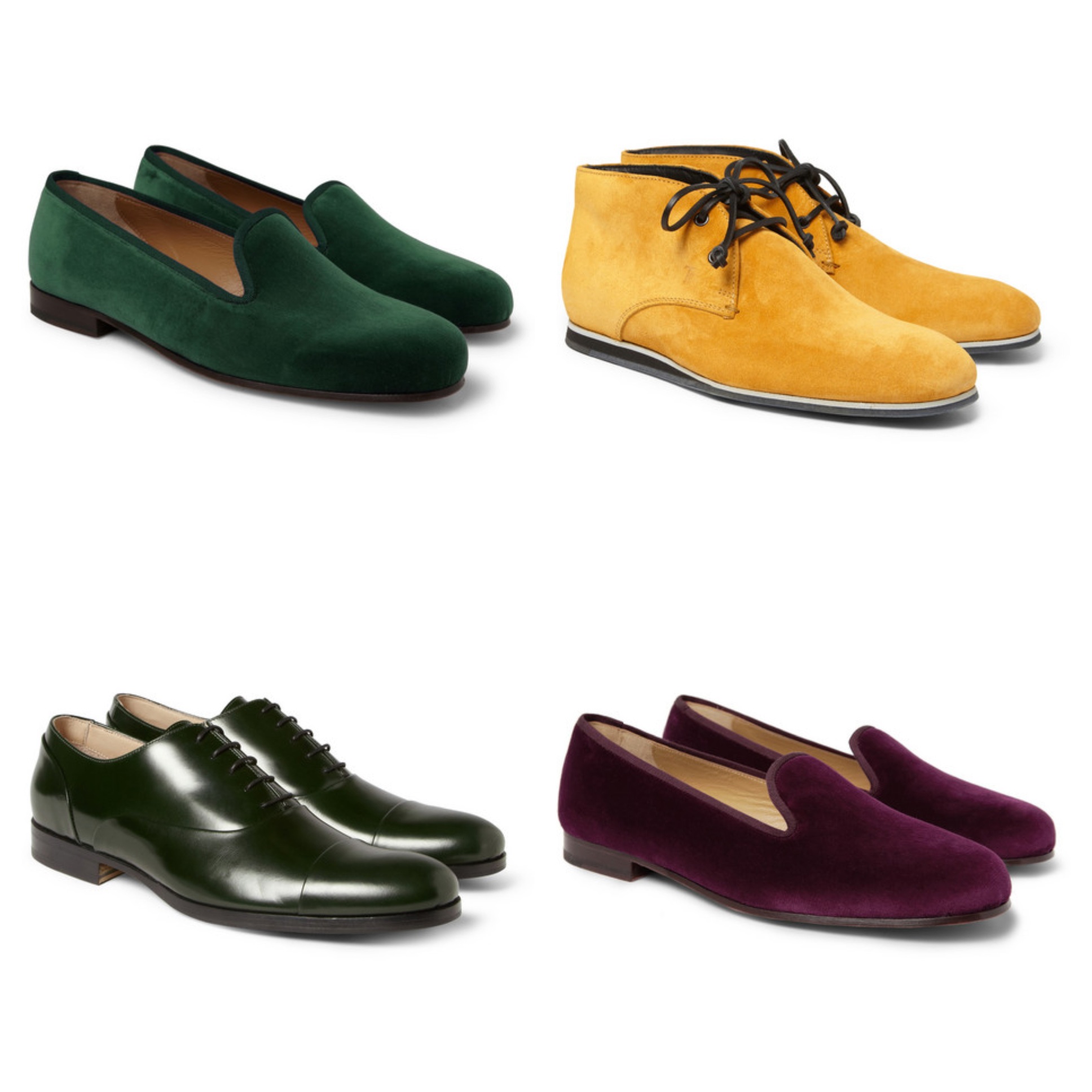 Both the green and purple velvet slippers are by Stubbs & Wootton’s, The yellow shoes are by Tod’s No_Code, The green oxford shoes are by Mr. Hare. All photos were taken from mrporter.com