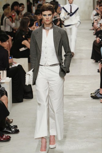CHANEL resort 2014 Singapore – White pants and top & grey jacket